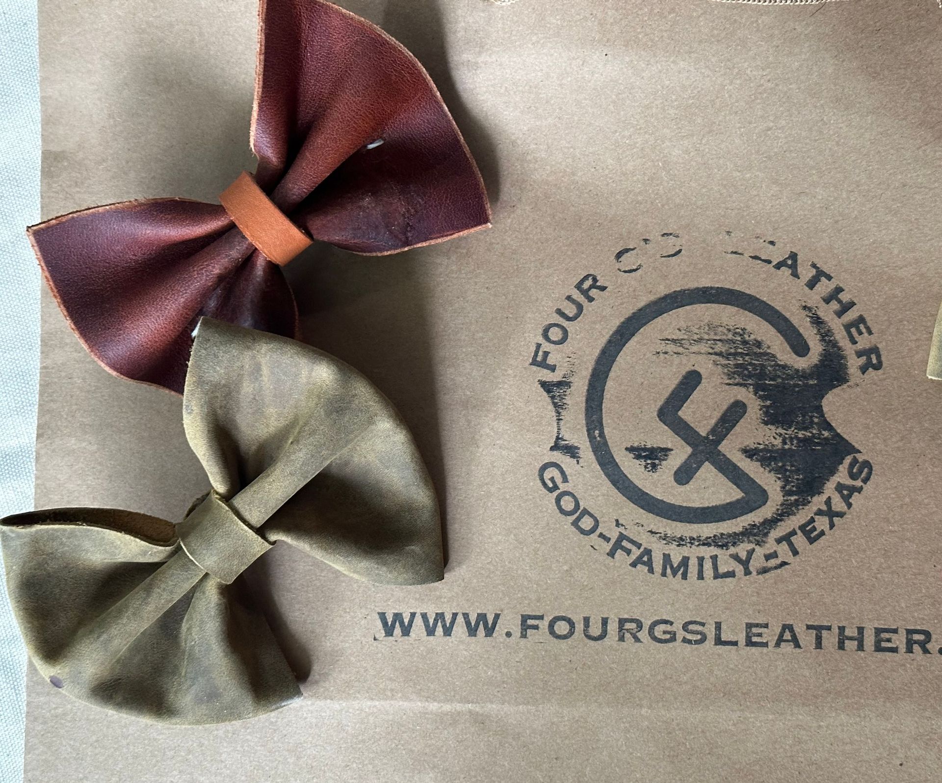 Its important for us to use up everybit of leather we can. We also make leather bows, leather earrings and we are working on leather bow ties as well. We are always expanding our product lines.