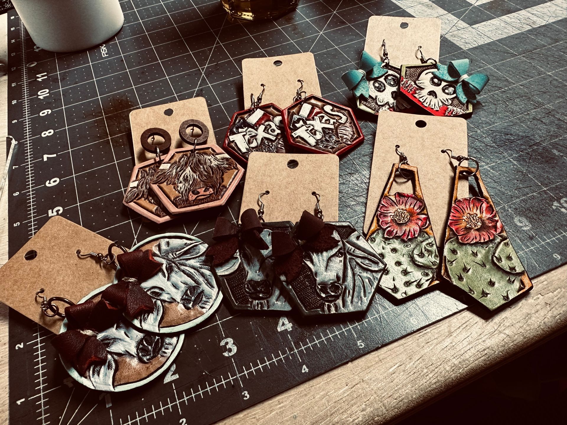 Leather earrings are super light weight which makes them easy to wear all day. Possibilities are endless with tooling, dyes, and shapes.